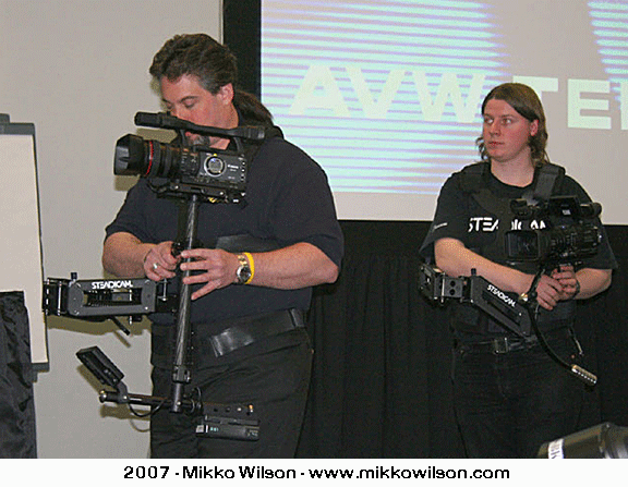 The Steadicam Pilot (above left) is a low cost ($3,995) Steadicam for cameras weighing up to about 10lbs. It features: A double section silky smooth Iso-Elastic arm with an amazing 28" boom range - which is equal to or more than any other arm on the Market except for Steadicam's own higher end arms. The arm uses the same technology as the highly regard Flyer and G-series Steadicam arms. A telescoping carbon fiber sled that is internally wired for 12v power and Composite video. A tools free micro adjustable X-Y camera stage with removable camera plate. The Steadicam Pilot is available initially with a choice of a 3.5" color 4:3 LCD monitor and a 12v AA battery back, or a 5.8" 16:9/4:3 color LCD and V-mount/Anton Bauer battery mounts. The sled base is highly adjustable for quick and easy balancing by moving the monitor, battery, and entire base. PLUS the base also accepts standard Steadicam Merlin counterweights to be screwed on in various locations as necessary to quickly add stabilizing mass. The Pilot comes with a super light weight low profile vest with standard features for fast adjust ability of fit, a fully adjustable "socket-block" to trim the arm to fly level and the option to mount the arm on either side of the operator. The sled and arm both break down into components for light and compact transportation. You can fit the whole system into a backpack. When you don't need the capacity and features of the Steadicam Flyer, the Steadicam Pilot is the perfect rig for most 1/3" cameras. The Steadicam Merlin can now carry more weight thanks to an optional upgrade of an all-metal gimble that allows the Merlin to carry cameras weighing up to 7lbs. (this would get tiring quickly, so...) The same arm and vest from the Steadicam Pilot system, are available as a kit with the metal Merlin Gimble and additional Merlin counterweights, as the "Merlin Arm & Vest" system (above right-$1,995) which allows the operator to shoot with a 7lb camera payload on the Merlin for (quite literally) hours! It's so light and comfortable that the camera will run out of tape before the operator tires.. The same arm as the Pilot provides for that huge 28" boom range - that can be increased by simply flying the Merlin off the arm into "handheld mode" mid shot (I tried this today myself, takes a bit of practice but very doable). The arm breaks down into 2 pieces for fast transportation with the folded Merlin and the packed lightweight vest. - Mikko Wilson - www.mikkowilson.com
